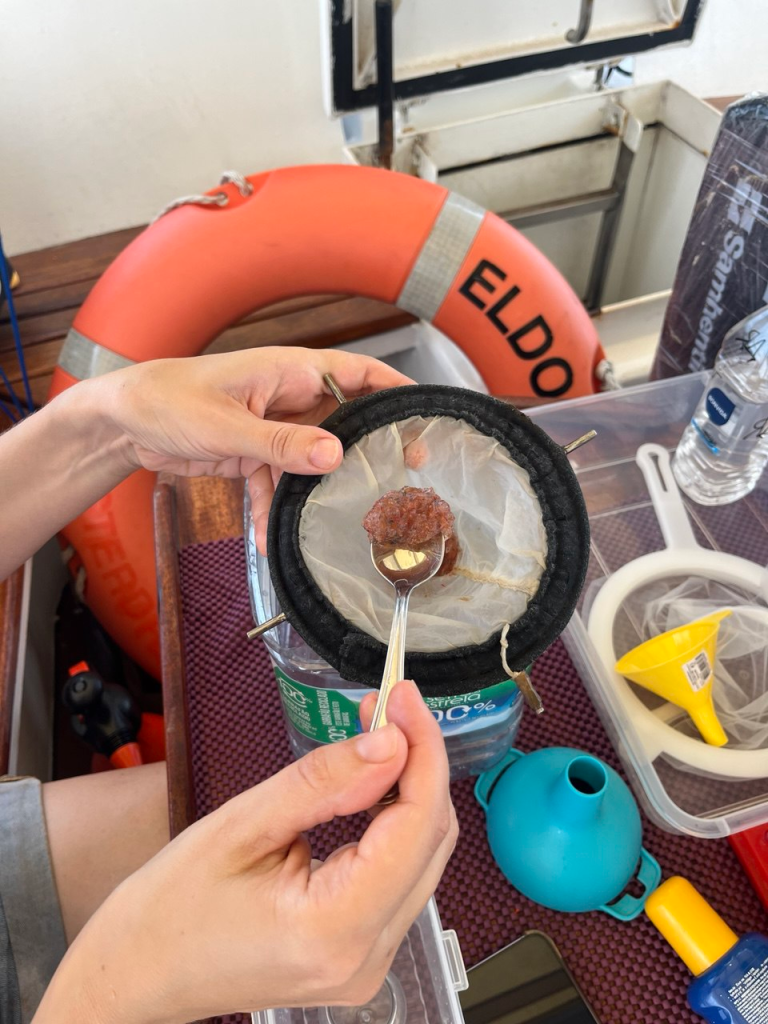 In our previous cruises, we focused on refining deep-sea zooplankton sampling techniques. This time, however, we turned our attention to the epipelagic zone — the sunlit upper layer of the open ocean, where most of the primary production takes place. During the expedition, we measured water transparency using a Secchi disk, recorded temperature profiles, and collected phytoplankton samples down to 70 meters and zooplankton samples down to 200 meters.